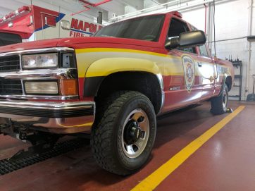 Brush 806 is primarily used as a brush fire truck, with a small pump located in the bed. Like 807, it is also sometimes used as a personnel vehicle for EMS runs.