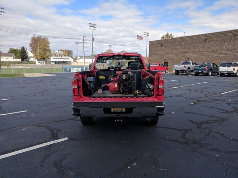 - A 2018 crew cab GMC Sierra purchased off the state bid contract. The emergency lights and radios were installed by PARR Public Safety, and graphics were done by Three Cord. This truck replaced a 1997 Chevy single cab pickup. The total cost of the project was $38,000. This apparatus is used for field fires, pulling trailers, and plowing snow. The truck holds a 300 gallon water tank with a 225 GPM Hale pump. The water tank and pump have been taken from the departments previous field fire trucks.